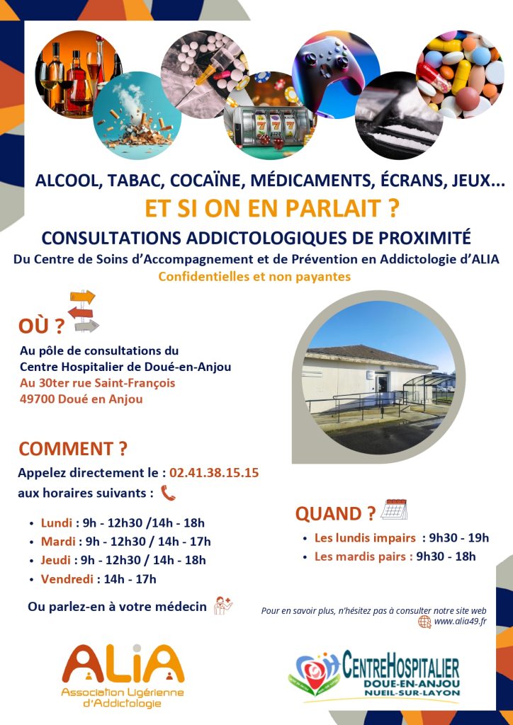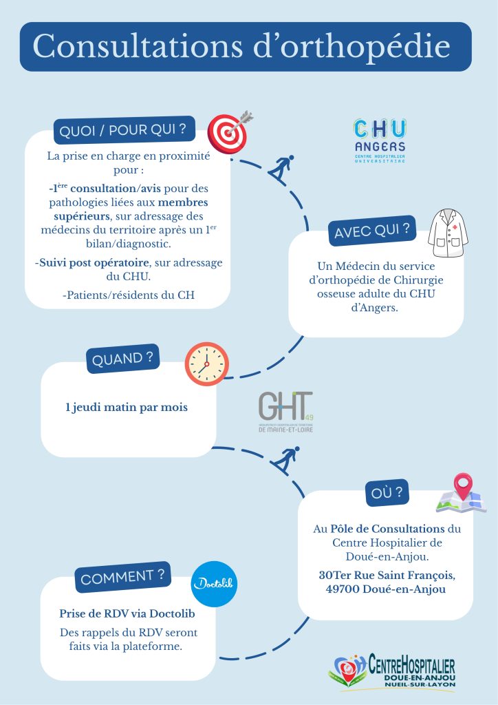 Le Centre Hospitalier de Doué-en-Anjou dispose d’un pôle de consultations externes offrant un accès à diverses spécialités médicales dont :
